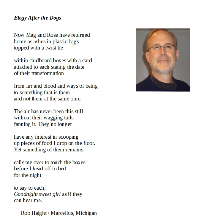 3rd Wednesday’s poem of the week is from the summer issue, now avialable in print from Amazon.com or you can download the free digital issue at our website. Rob Haight is the author of Emergences and Spinner Falls (Inland Seas) and Feeding Wild Birds.