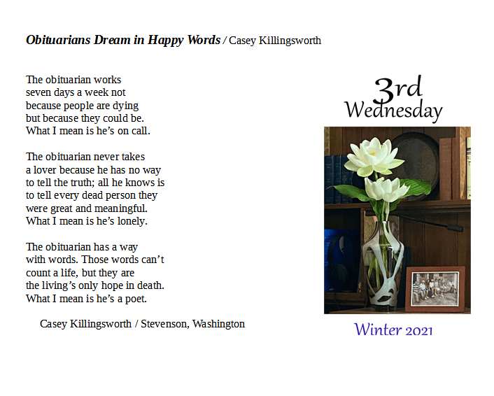 3rd Wednesday’s poem of the week by Casey Killingsworth is from our Winter Issue, now available in print at Amazon.com and free in PDF format at our website.