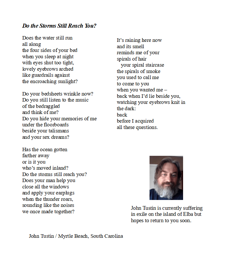 Do the Storms Still Reach You / John Tustin Published on October 29, 2021 by Editorial Staff Find more of John Tustin’s Poetry at http://fritzware.com/johntustinpoetry/ Share this: Click to share on X (Opens in new window) X Click to share on Facebook (Opens in new window) Facebook Like Loading... Related