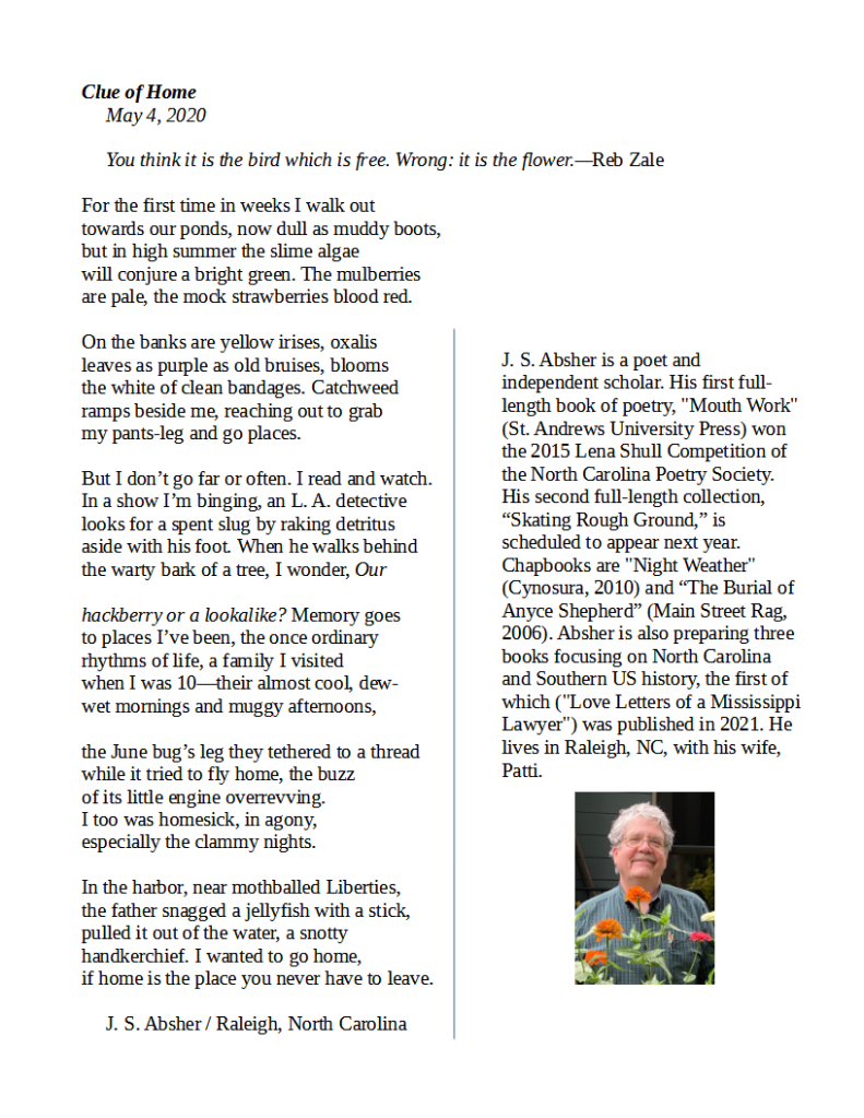 Clue of Home / J. S. Absher Published on November 12, 2021November 12, 2021 by Editorial Staff Find J. S. Absher at https://www.js-absher-poetry.com/#/Share this: Click to share on X (Opens in new window) X Click to share on Facebook (Opens in new window) Facebook Like Loading... Related
