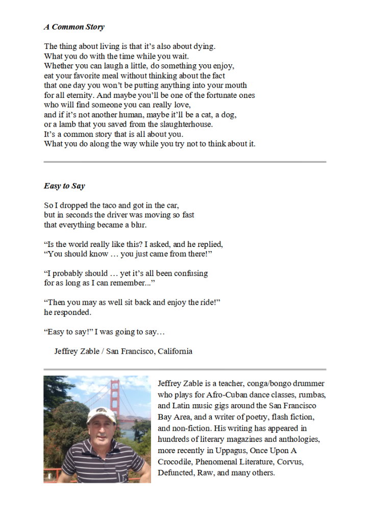 Two Poems by Jeffrey Zable Published on January 9, 2022 by Editorial Staff Share this: Click to share on X (Opens in new window) X Click to share on Facebook (Opens in new window) Facebook Like Loading... Related