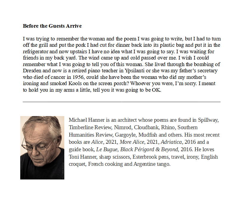 Before the Guests Arrive / Michael Hanner Published on February 1, 2022 by Editorial Staff Share this: Click to share on X (Opens in new window) X Click to share on Facebook (Opens in new window) Facebook Like Loading... Related