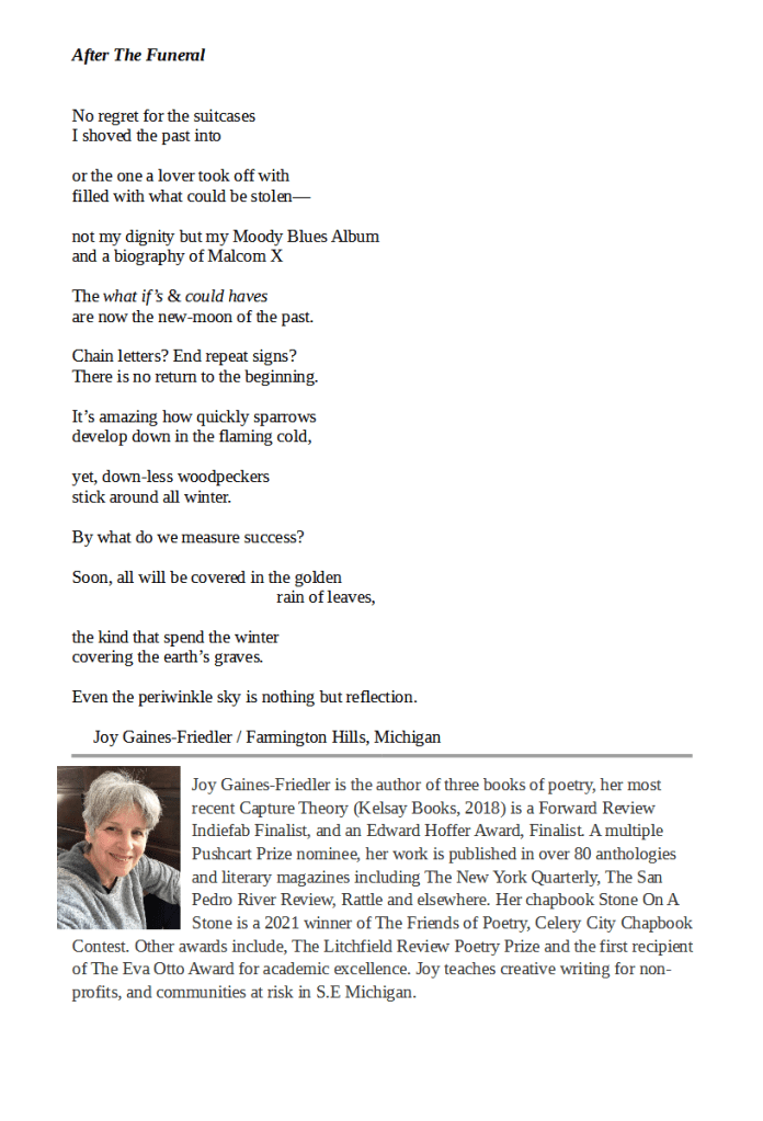 After the Funeral / Joy Gaines-Friedler Published on February 27, 2022February 28, 2022 by Editorial Staff Share this: Click to share on X (Opens in new window) X Click to share on Facebook (Opens in new window) Facebook Like Loading... Related