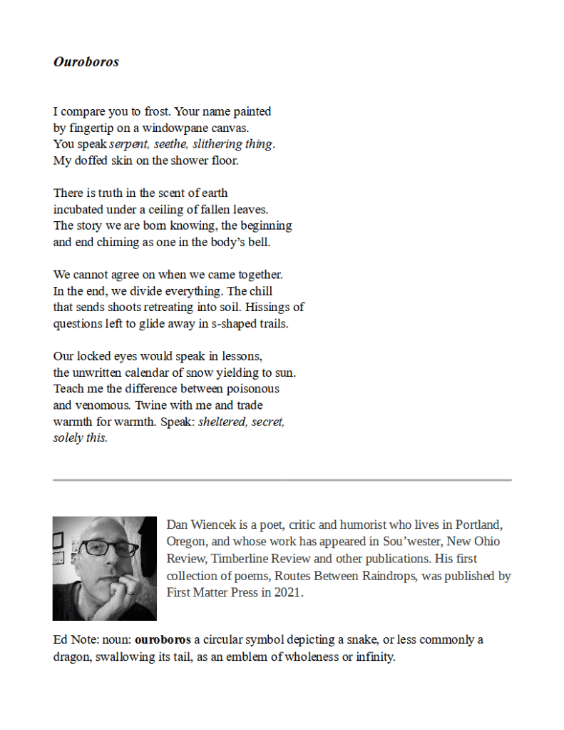 Ouroboros / Dan Wiencek Published on March 15, 2022 by Editorial Staff Share this: Click to share on X (Opens in new window) X Click to share on Facebook (Opens in new window) Facebook Like Loading... Related