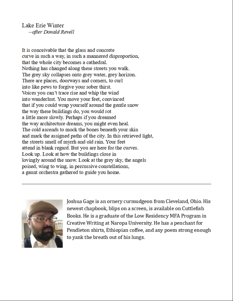 I loved “Lake Erie Winter” by Joshua Gage (self-proclaimed curmudgeon) from start to finish. Thanks, David, for giving this graceful piece of work the special recognition it deserves.