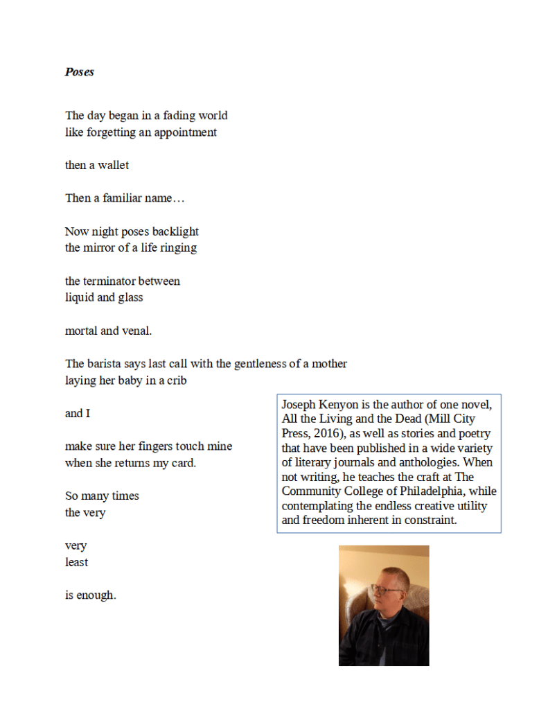 Poses / Joseph Kenyon Published on January 9, 2023 by Editorial Staff https://www.josephkenyonlit.com/ Share this: Click to share on X (Opens in new window) X Click to share on Facebook (Opens in new window) Facebook Like Loading... Related