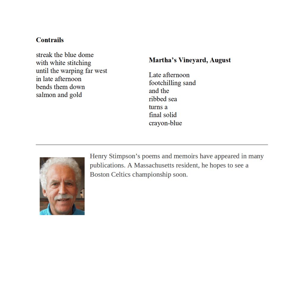 2 Poems by Henry Stimpson Published on February 8, 2023 by Editorial Staff Share this: Click to share on X (Opens in new window) X Click to share on Facebook (Opens in new window) Facebook Like Loading... Related