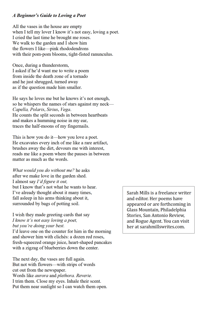 A Beginner’s Guide to Loving a Poet / Sarah Mills Published on May 30, 2023 by Editorial Staff Share this: Click to share on X (Opens in new window) X Click to share on Facebook (Opens in new window) Facebook Like Loading... Related
