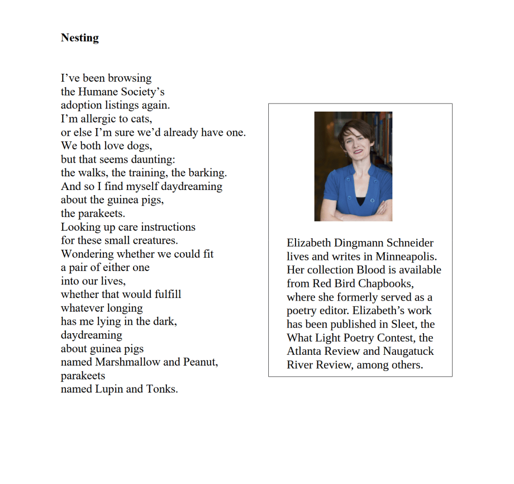 Nesting / Elizabeth Schneider Published on July 13, 2023 by Editorial Staff Share this: Click to share on X (Opens in new window) X Click to share on Facebook (Opens in new window) Facebook Like Loading... Related