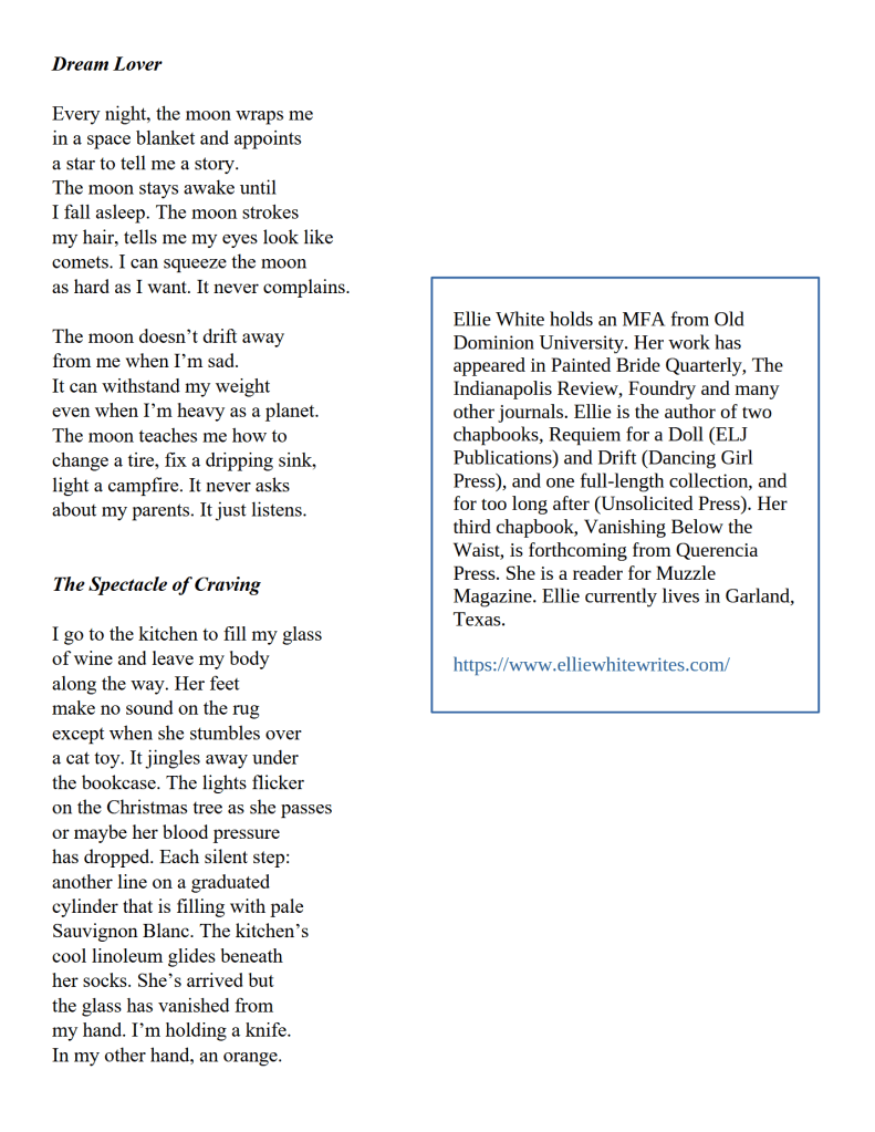 Two Poems by Ellie White Published on September 30, 2023 by Editorial Staff Share this: Click to share on X (Opens in new window) X Click to share on Facebook (Opens in new window) Facebook Like Loading... Related