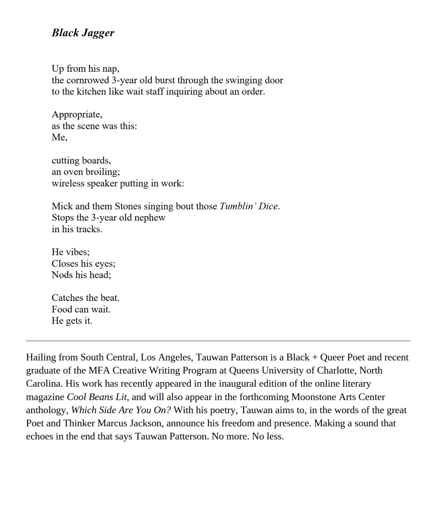 Black Jagger / Tauwan Patterson Published on October 3, 2023 by Editorial Staff Share this: Click to share on X (Opens in new window) X Click to share on Facebook (Opens in new window) Facebook Like Loading... Related