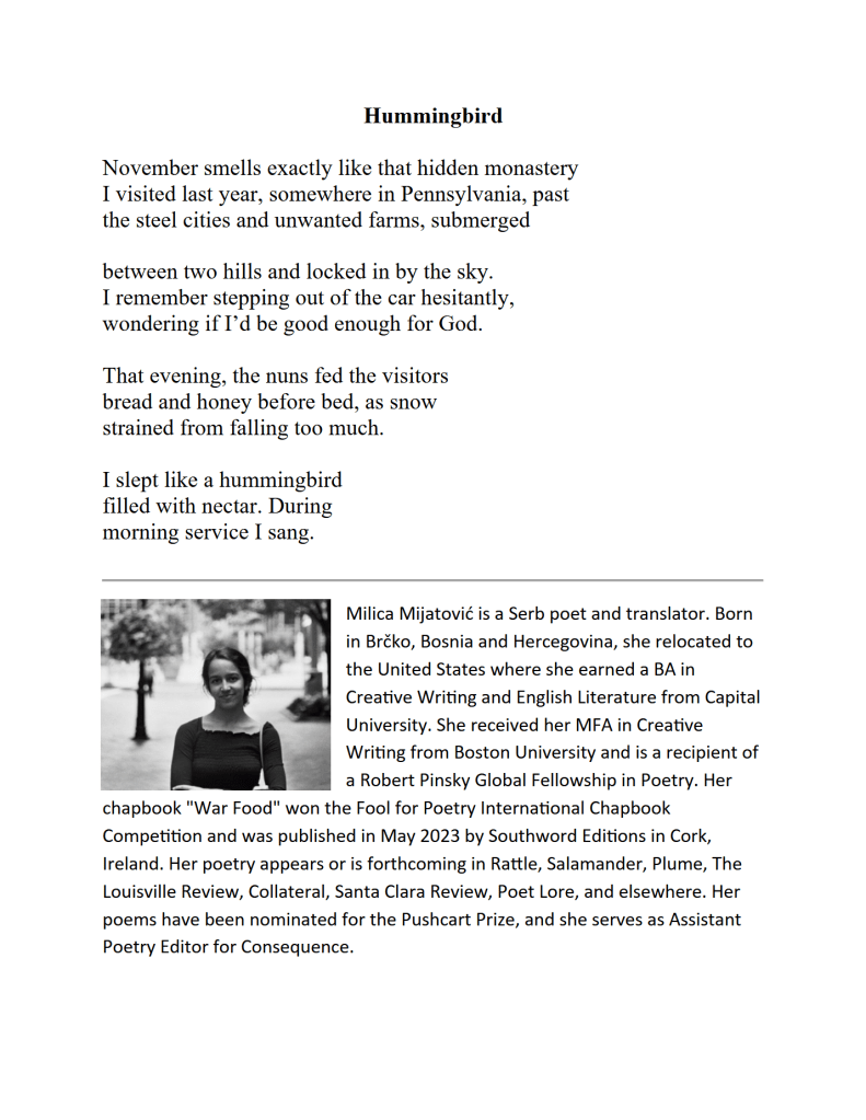 Hummingbird / Milica Mijatović Published on October 16, 2023 by Editorial Staff https://www.milicamijatovic.com/poetry Share this: Click to share on X (Opens in new window) X Click to share on Facebook (Opens in new window) Facebook Like Loading... Related
