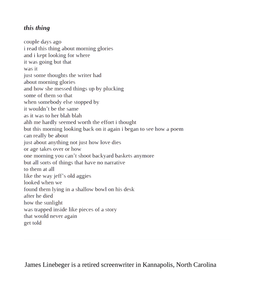 this thing / James Lineberger Published on October 19, 2023November 28, 2023 by Editorial Staff Share this: Click to share on X (Opens in new window) X Click to share on Facebook (Opens in new window) Facebook Like Loading... Related