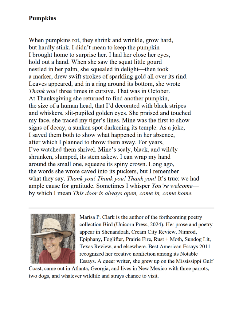 Pumpkins / Marisa P. Clark Published on November 29, 2023 by Editorial Staff Share this: Click to share on X (Opens in new window) X Click to share on Facebook (Opens in new window) Facebook Like Loading... Related