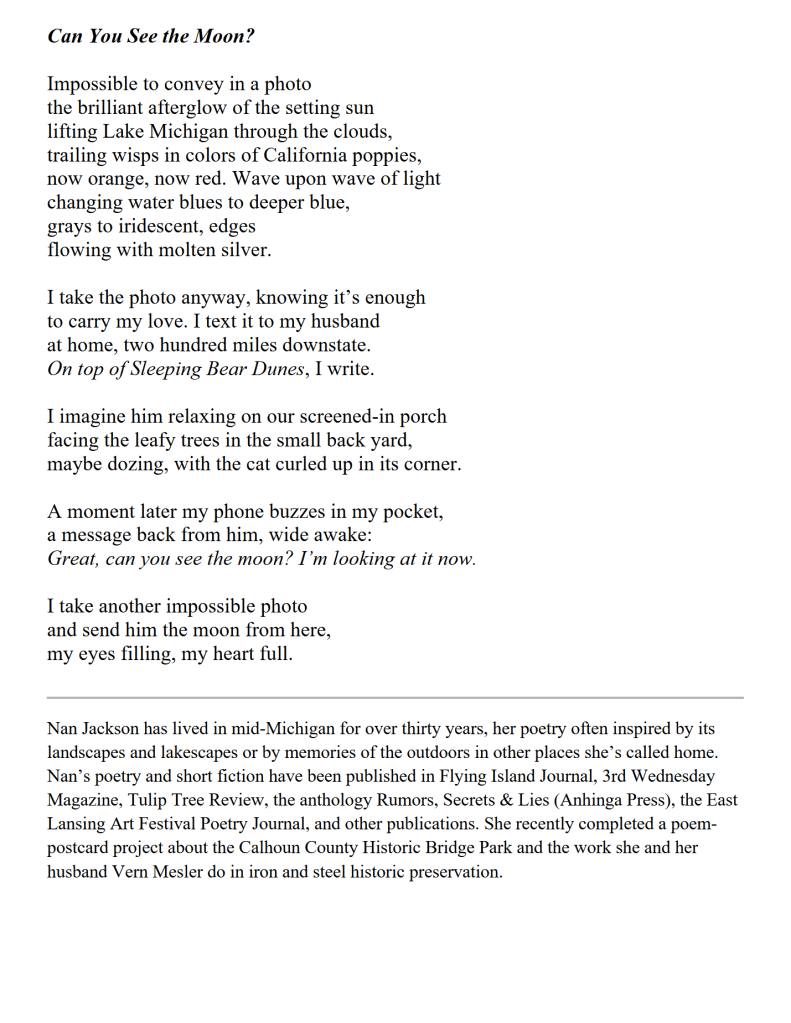 Can You See the Moon? Nan Jackson Published on March 1, 2024 by Editorial Staff Share this: Click to share on X (Opens in new window) X Click to share on Facebook (Opens in new window) Facebook Like Loading... Related