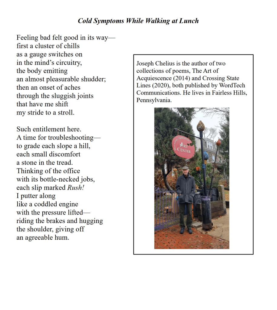 Cold Symptoms While Walking at Lunch / Joseph Chelius Published on March 22, 2024 by Editorial Staff Share this: Click to share on X (Opens in new window) X Click to share on Facebook (Opens in new window) Facebook Like Loading... Related