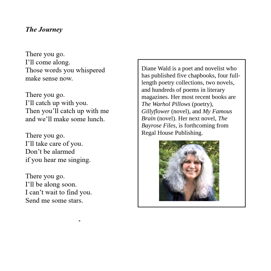 Diane Wald may identify herself first as a novelist, but she is clearly a splendid poet as well. I was deeply moved by “The Journey”, thanks to its graceful use of simple, straightforward diction, and the heartfelt message itself. Very well done.