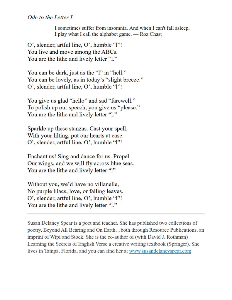 Ode to the Letter L / Susan Delaney Spear Published on September 7, 2024September 8, 2024 by Editorial Staff Share this: Click to share on X (Opens in new window) X Click to share on Facebook (Opens in new window) Facebook Like Loading... Related