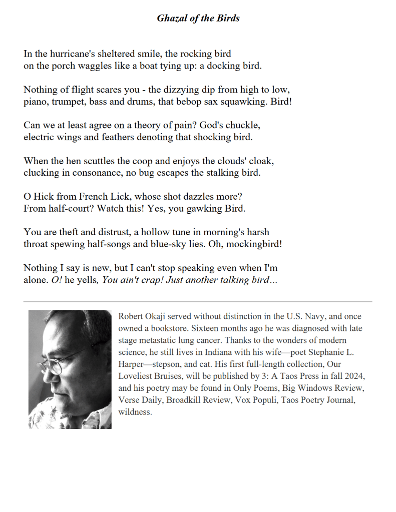Ghazal of the Birds / Robert Okaji Published on September 24, 2024 by Editorial Staff https://robertokaji.com/ Share this: Click to share on X (Opens in new window) X Click to share on Facebook (Opens in new window) Facebook Like Loading... Related