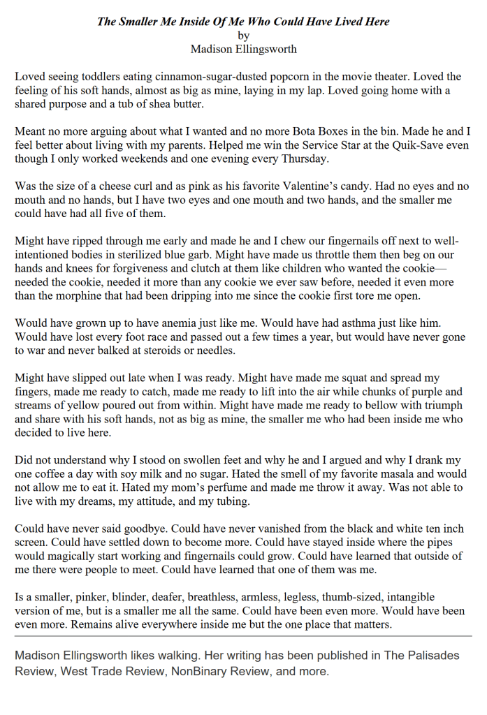 One thought on “The Smaller Me Inside Of Me Who Could Have Lived Here /Madison Ellingsworth”