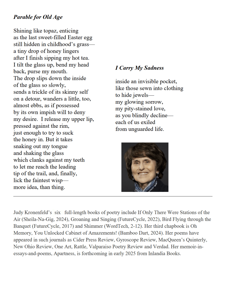 Two Poems / Judy Kronenfeld Published on November 21, 2024November 23, 2024 by Editorial Staff https://judykronenfeld.com/ Share this: Click to share on X (Opens in new window) X Click to share on Facebook (Opens in new window) Facebook Like Loading... Related