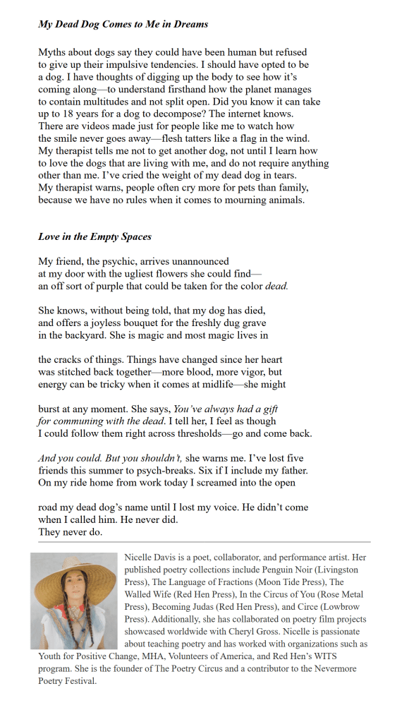 2 Poems by Nicelle Davis Published on February 20, 2025 by Editorial Staff Share this: Click to share on X (Opens in new window) X Click to share on Facebook (Opens in new window) Facebook Like Loading... Related