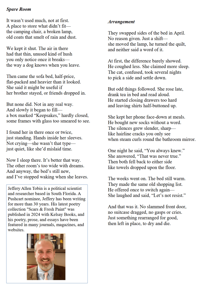 Two Poems by Jeffery Tobin Published on May 30, 2025 by Editorial Staff https://www.jefferyatobin.com/ Share this: Click to share on X (Opens in new window) X Click to share on Facebook (Opens in new window) Facebook Like Loading... Related