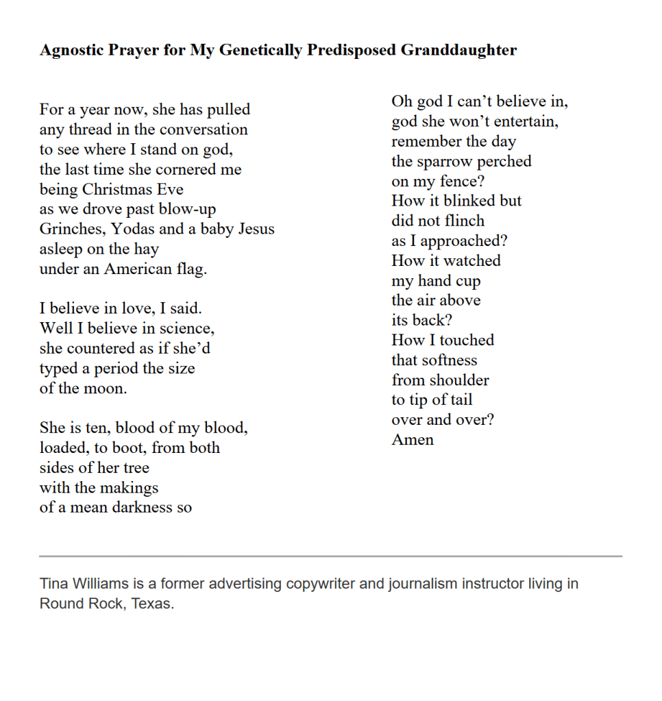 Agnostic Prayer for My Genetically Predisposed Granddaughter / Tina Williams Published on May 31, 2025 by Editorial Staff Share this: Click to share on X (Opens in new window) X Click to share on Facebook (Opens in new window) Facebook Like Loading... Related