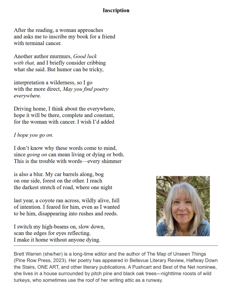 Inscription / Brett Warren Published on July 6, 2025July 8, 2025 by Editorial Staff https://www.brettwarrenpoetry.com/ Share this: Click to share on X (Opens in new window) X Click to share on Facebook (Opens in new window) Facebook Like Loading... Related