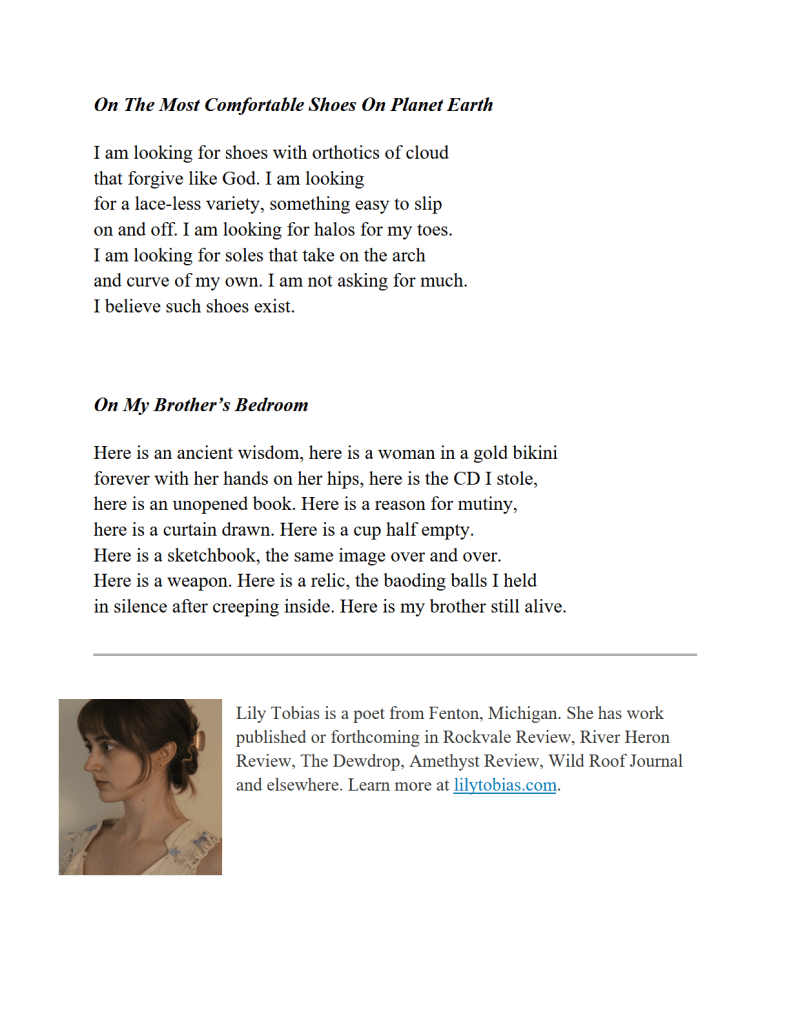 2 Poems by Lily Tobias Published on July 14, 2025 by Editorial Staff https://lilytobias.com/ Share this: Click to share on X (Opens in new window) X Click to share on Facebook (Opens in new window) Facebook Like Loading... Related