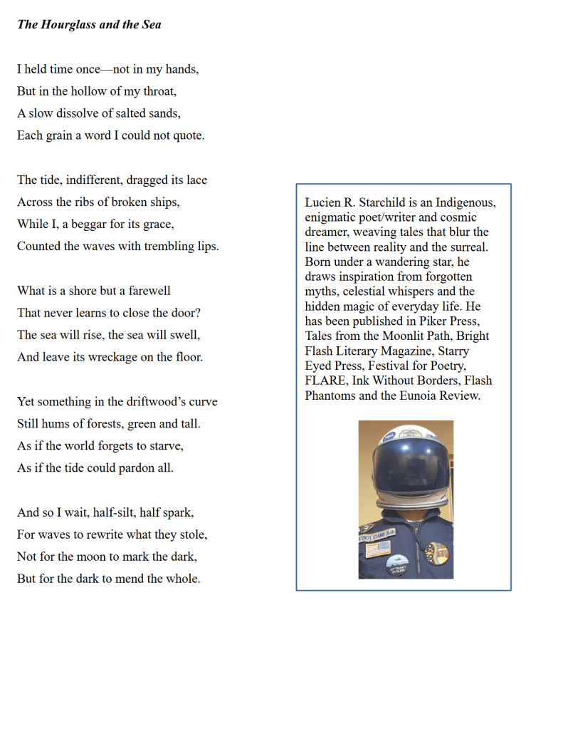 The Hourglass and the Sea / Lucien R. Starchild Published on August 14, 2025 by Editorial Staff https://lucienrstarchild.com/ Share this: Click to share on X (Opens in new window) X Click to share on Facebook (Opens in new window) Facebook Like Loading... Related