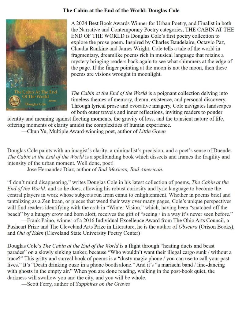 Douglas Cole has published two novels and eight poetry collections, including The Cabin at the End of the World, winner of the Best Book Award in Urban Poetry and the International Impact Book Award. The White Field, won the 2021 American Fiction Award, and his screenplay of The White Field won Best Unproduced Screenplay award in the Elegant Film Festival. His work has appeared in Beloit Poetry, Fiction International, Valpariaso, The Gallway Review and Two Hawks Quarterly. He also contributes a column called “Trading Fours” to the magazine, Jerry Jazz Musician. He received the Leslie Hunt Memorial prize in poetry, the Best of Poetry Award from Clapboard House, First Prize in the “Picture Worth 500 Words” from Tattoo Highway, and the Editors’ Choice Award in fiction by RiverSedge. He has been nominated Eight times for a Pushcart and Nine times for Best of the Net. His website is https://douglastcole.com.