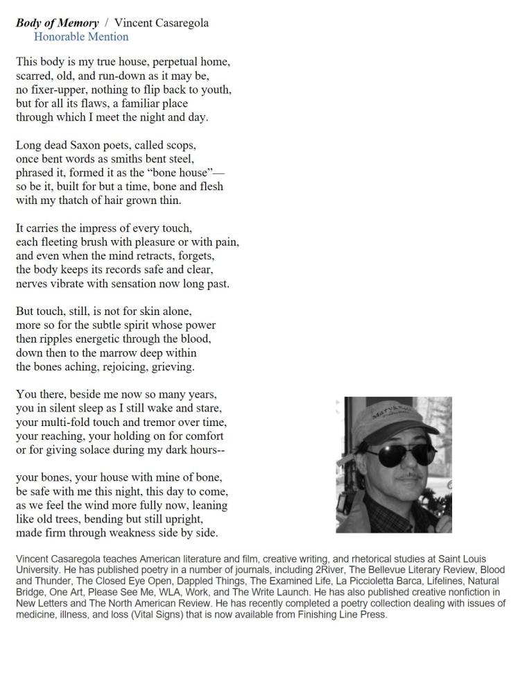 Body of Memory / Vincent Casaregola Published on March 12, 2026 by Editorial Staff An honorable mention selected by contest judge, Marilyn Taylor, from our annual poetry contest. Share this: Share on X (Opens in new window) X Share on Facebook (Opens in new window) Facebook Like Loading... Related