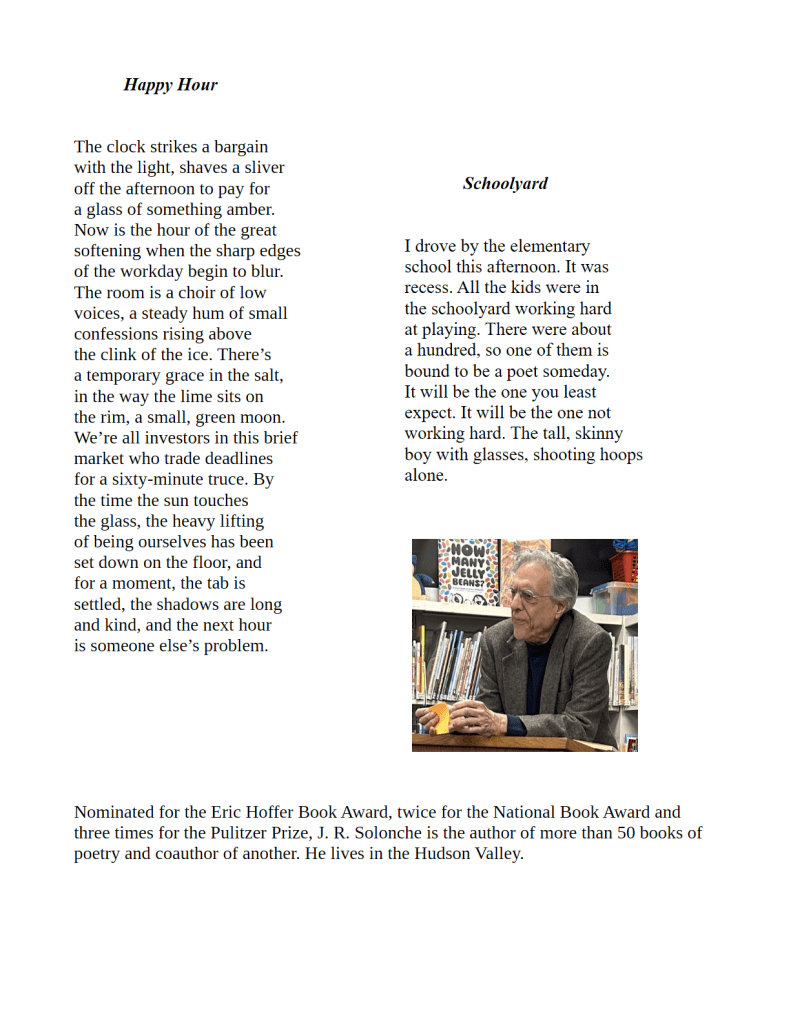 Two Poems by J. R. Solonche Published on March 28, 2026 by Editorial Staff Share this: Share on X (Opens in new window) X Share on Facebook (Opens in new window) Facebook Like Loading... Related