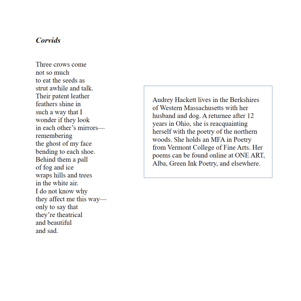 Corvids / Audrey Hackett Published on April 1, 2026 by Editorial Staff Share this: Share on X (Opens in new window) X Share on Facebook (Opens in new window) Facebook Like Loading... Related