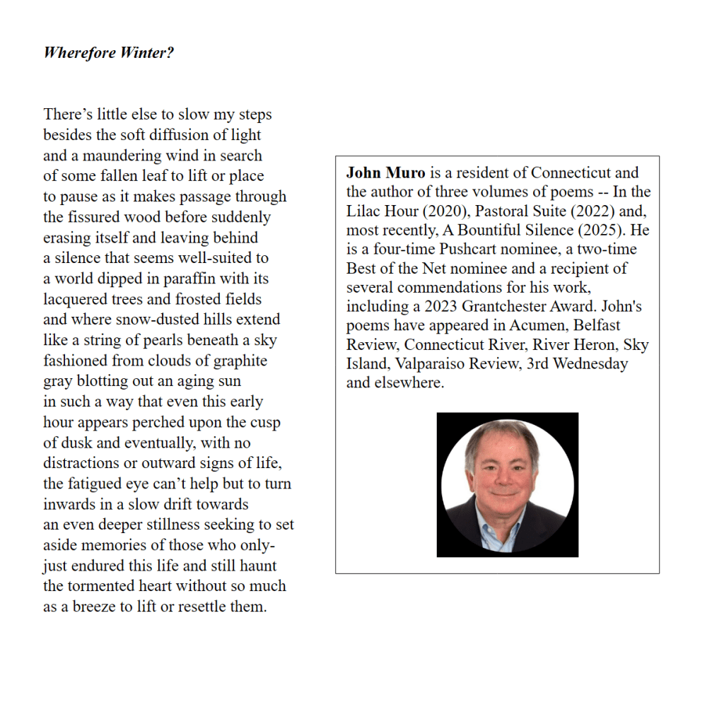 Wherefore Winter? / John Muro Published on April 11, 2026 by Editorial Staff Share this: Share on X (Opens in new window) X Share on Facebook (Opens in new window) Facebook Like Loading... Related