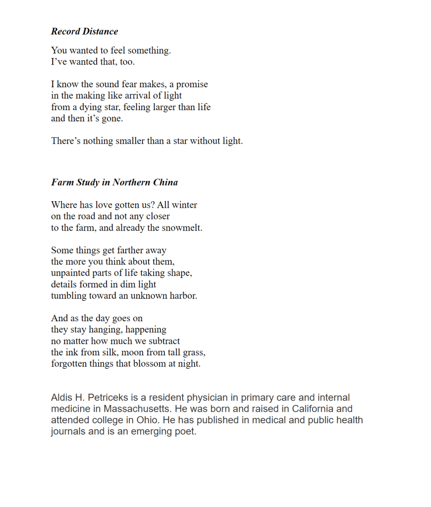 Two Poems by Aldis H. Petriceks Published on April 23, 2026 by Editorial Staff Share this: Share on X (Opens in new window) X Share on Facebook (Opens in new window) Facebook Like Loading... Related