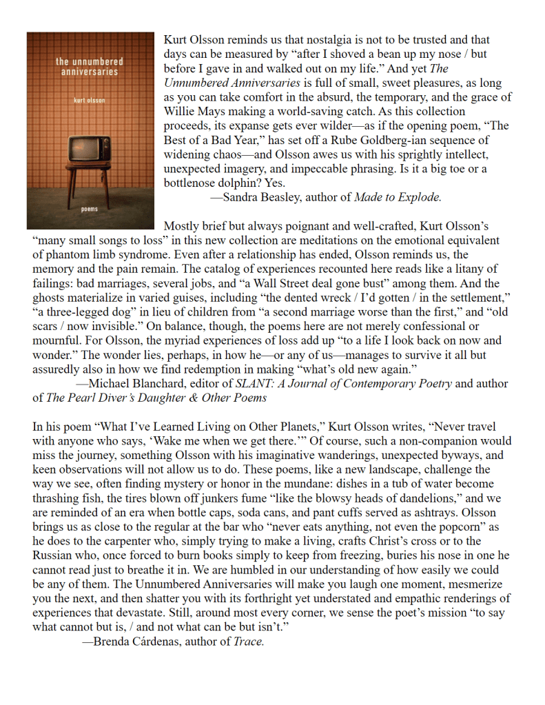 The Unnumbered Anniversaries is Kurt’s third poetry collection. Of his second book, Burning Down Disneyland, Thomas Lux wrote, “I love the innovative mischief of its poems. Let it be known: a true poetic intelligence and imagination live between its covers.” Kurt’s first book, What Kills What Kills Us, won the Gerald Cable Book Award; the Towson University Prize for Literature, given annually to the best book published by a Maryland writer; and Peace Corps Writers’ Best Poetry Book of 2008.
