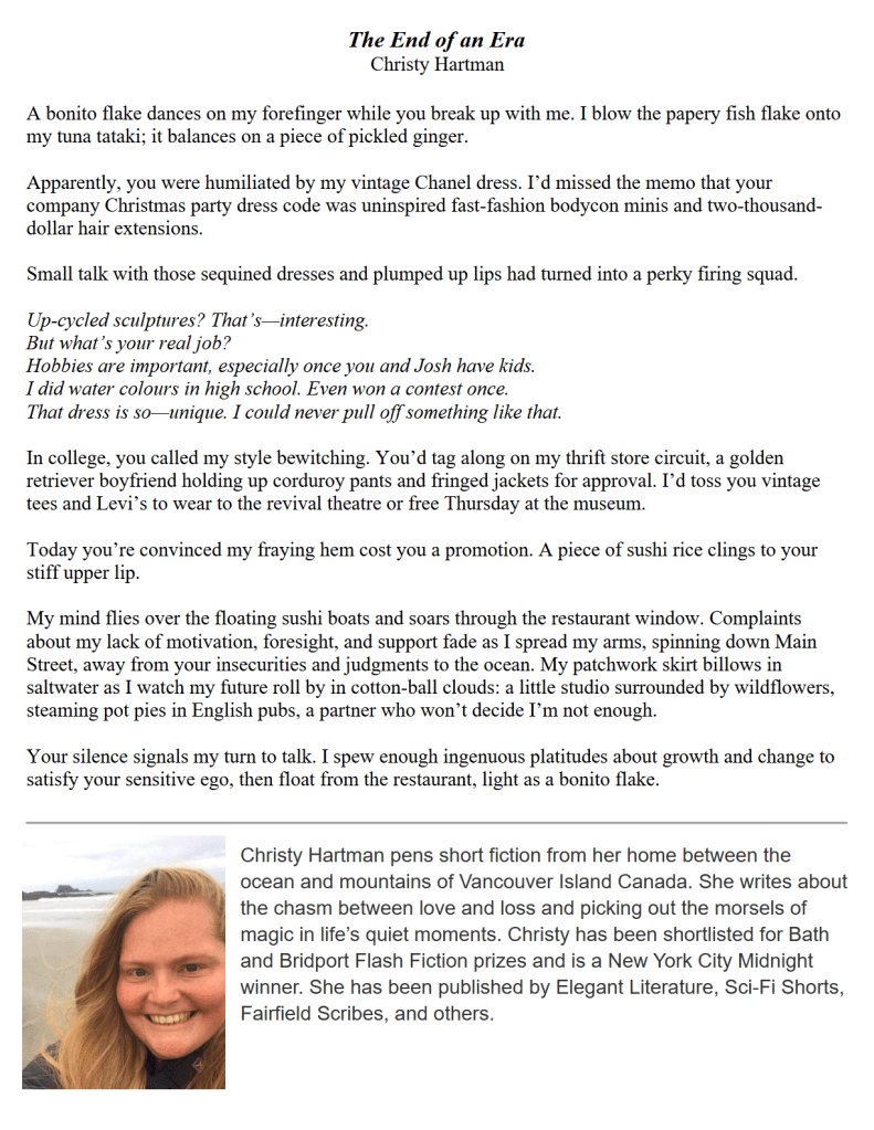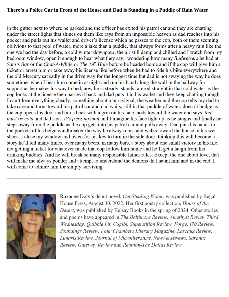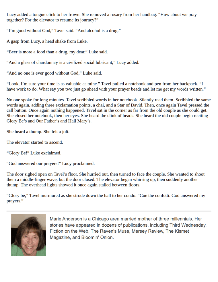 Jane Hertenstein is a Pushcart nominee whose work has been recognized by the New York Times. She is the author of over 100 published stories both macro and micro: fiction, creative non-fiction, and blurred genre. In addition she has published two MG novels and a non-fiction project, Orphan Girl: The Memoir of a Chicago Bag Lady, which garnered national reviews. Jane is the recipient of a grant from the Illinois Arts Council. She teaches a workshop on Flash Memoir.