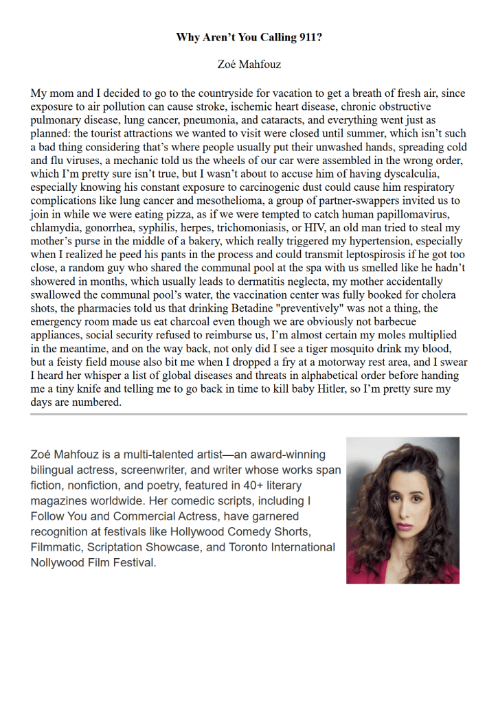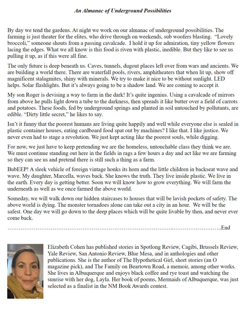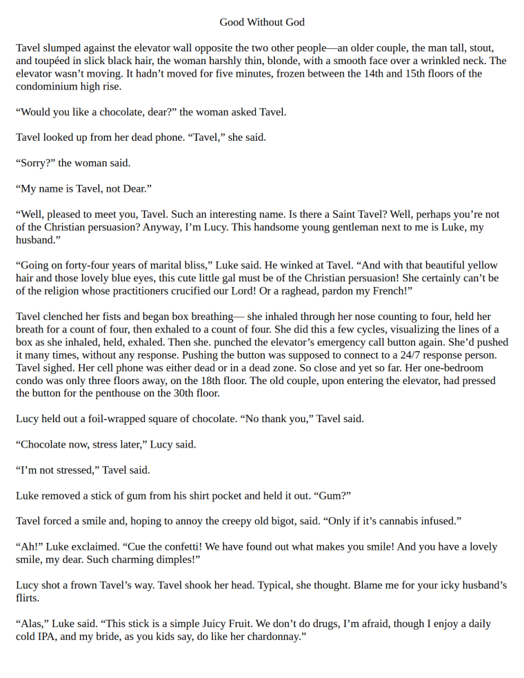 Sometimes, late at night, she’d awake or—more often than not—she’d been unable to fall asleep—and type into her Kindle Fire by the bedside: Tell me the future. Once she asked the universe, more specifically: What is that blurry thing off in the distance that looks like trees waving in the wind? And the ChatGPT came up with an answer: You’re off your rocker.