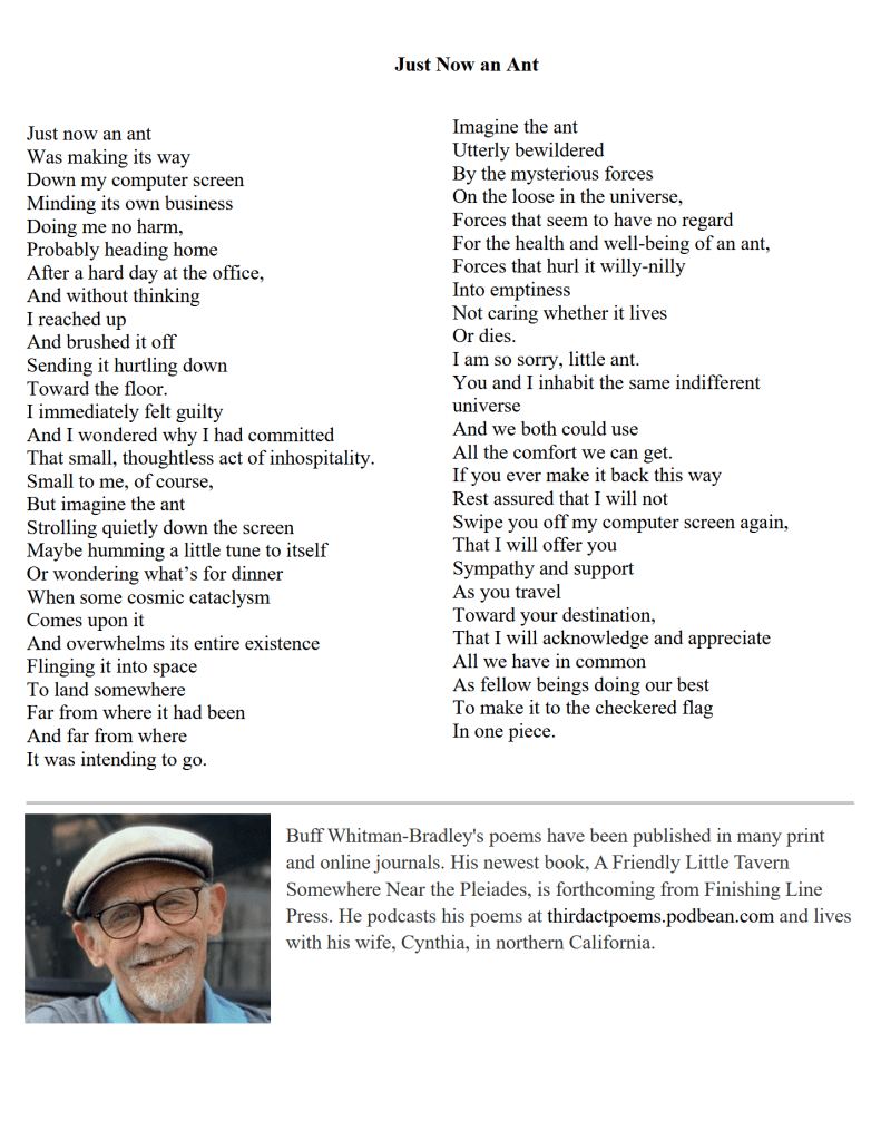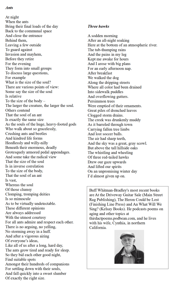 The winter 2024 issue will feature the poems of Buff Whitman Bradley, a poet who has contributed to our pages several times. Buff podcasts at Third Act Poems.