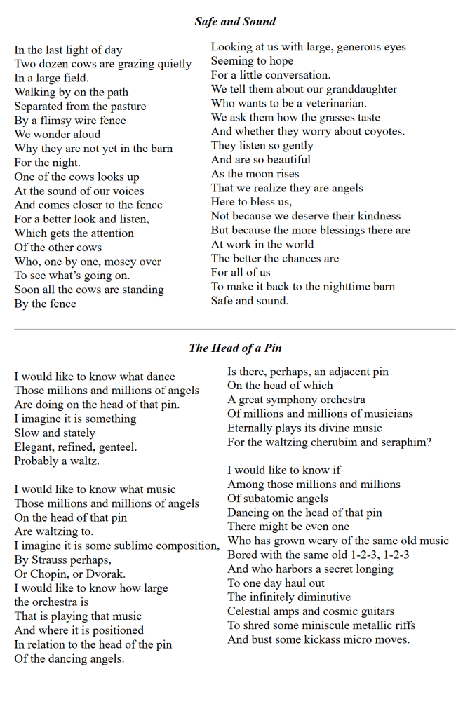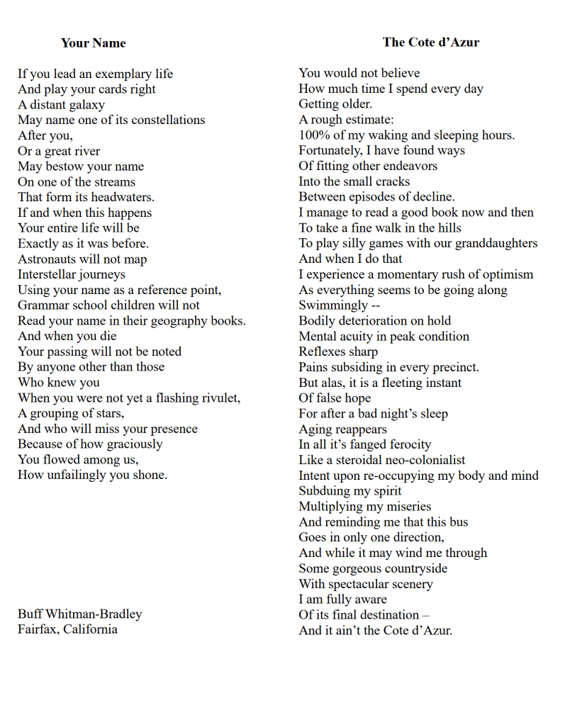 Buff Whitman-Bradley’s poems have appeared in many print and online journals. His newest book is “At the Driveway Guitar Sale” (Main Street Rag Publishing). Two more books are forthcoming in 2022 — “The Heron Could be Lost” (Finishing Line Press) and “And What Will We Sing?” (Kelsay Books) He podcasts at thirdactpoems.podbean.com and lives with his wife, Cynthia, in norther California.