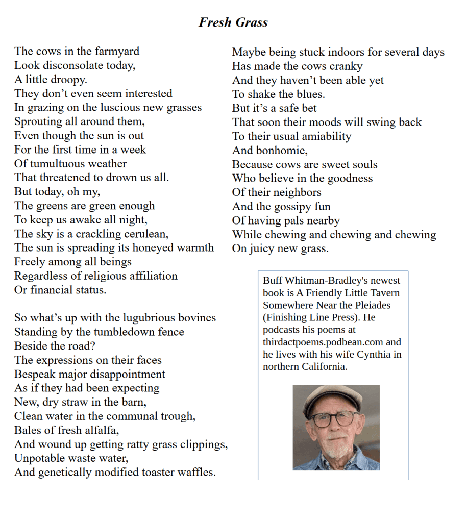 Buff Whitman-Bradley’s newest book is A Friendly Little Tavern Somewhere Near the Pleiades (Finishing Line Press). He podcasts poems at thirdactpoems.podbean.com and lives in northern California with his wife, Cynthia.