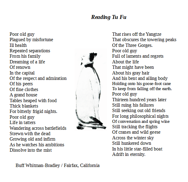 With his signature grace and economy, Buff Whitman-Bradley tackles the unimaginable; the body’s elemental breakdown and the proverbial leap into the unknown which awaits us all. Never settling for abstraction or platitude, these poems are as rugged and beautiful as the California landscapes humming in the background. And though he may have given up on his plan ‘to be an ancient Chinese poet’, something of their wild humor and gem-like clarity shines on every page. ~Seth Jani, Publisher and Editor of Seven CirclePress, Author of Night Fable