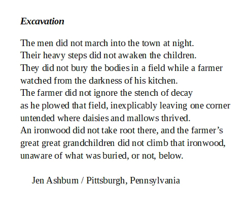 3rd Wednesday’s poem of the week is a preview from our summer issue due out near the end of June. Poet, Jen Ashburn, won our 50/50 poetry contest with this entry. We’re accepting submissions for the fall issue now. Copies of print issues of the magazine can be purchaced at Amazon.