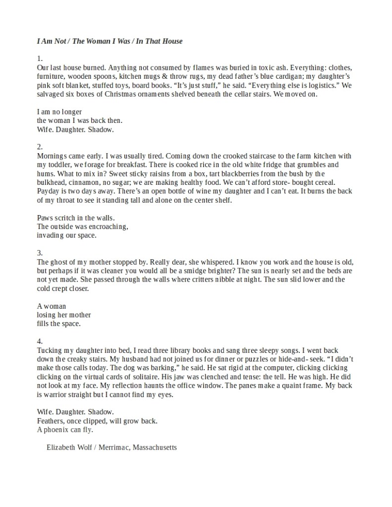 3rd Wednesday’s poem of the week is a prize winner from our spring issue’s annual poetry contest. Elizabeth Wolf won one of three $100 awards for this “Haibun”, which she says was her first attempt at this prosometric form that originated in Japan. Each of the stazas is expanded by the Senryū at its conclusion.