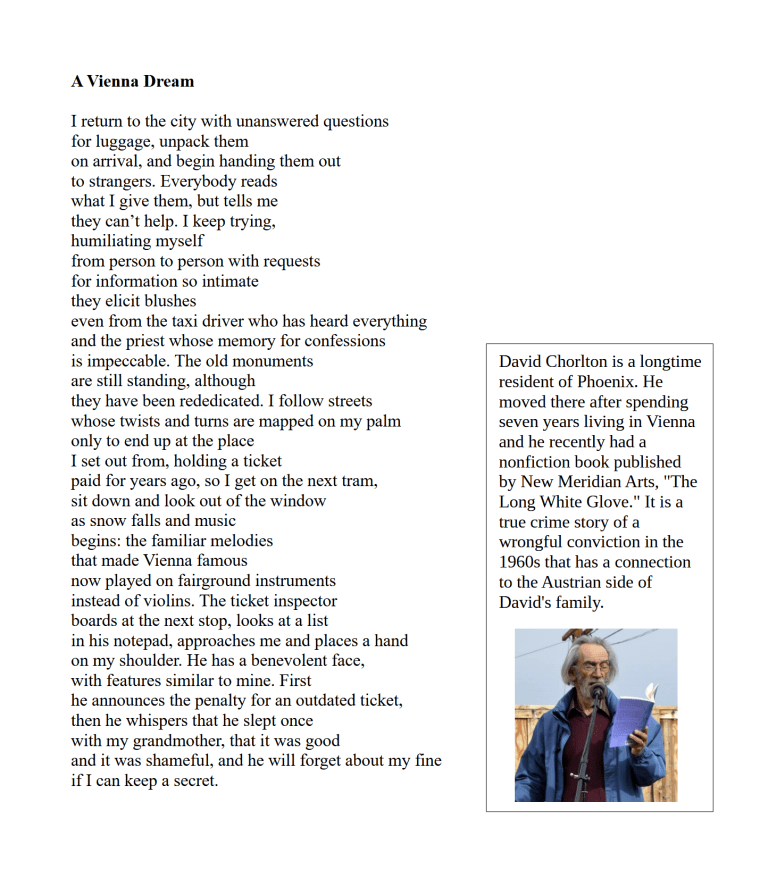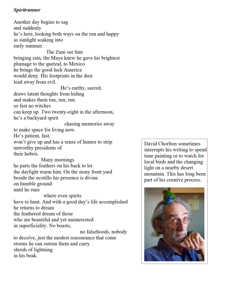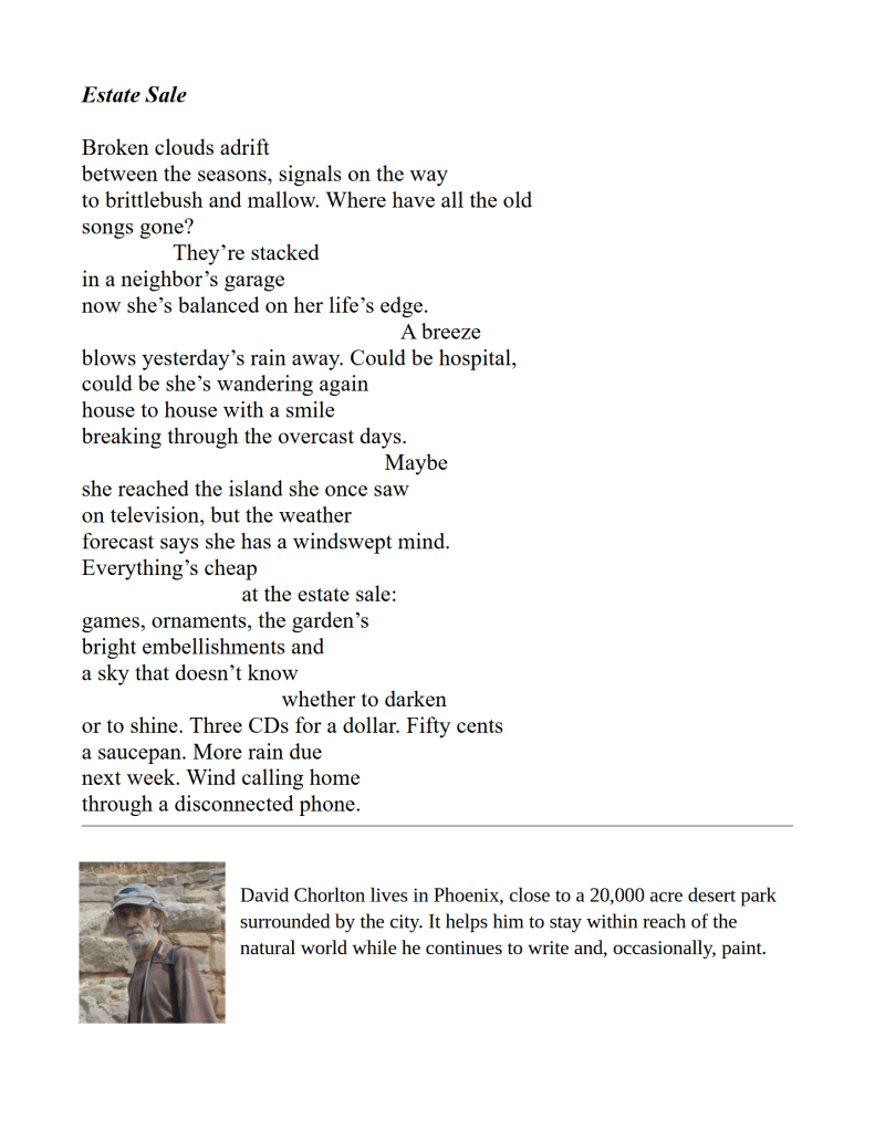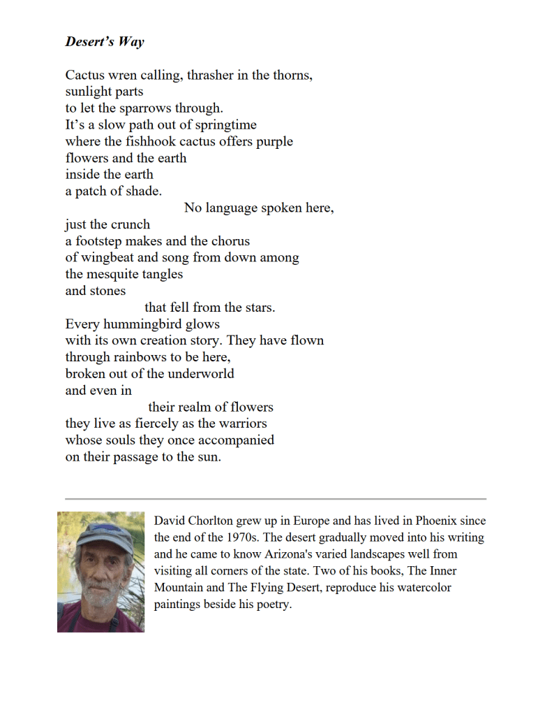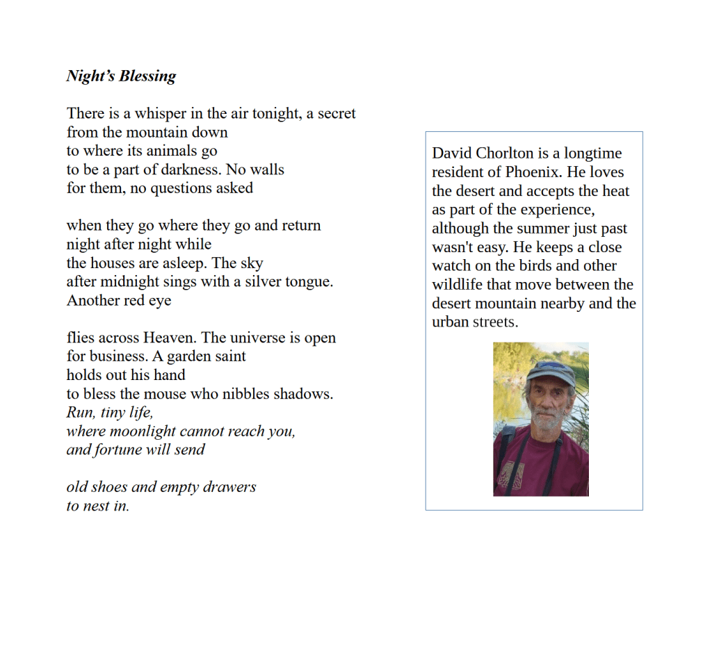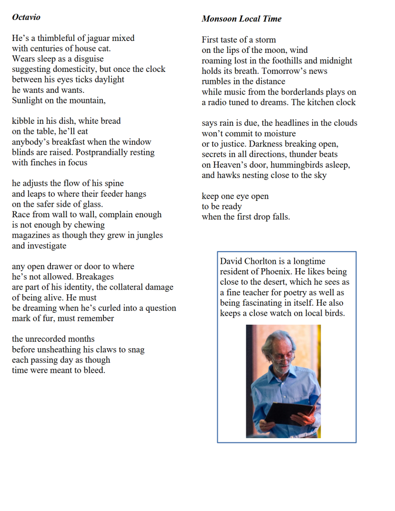 David Chorlton has been selected as our featured poet for the autumn issue of 3rd Wednesday. Here are three of his marvelously graceful and image-rich poems.
