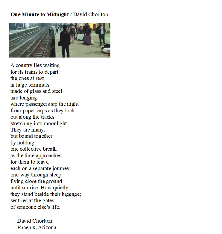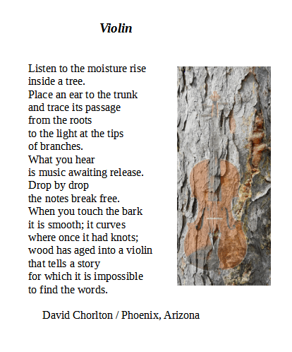 Here is 3rd Wednesday’s poem of the week from the Winter Issue. In his cover letter David wrote: “I’m happy to see print magazines continue in the digital age, as I prefer to hold my reading matter in my hands than to look at a screen! I write because doing so hasn’t lost its meaning to me, and because I feel I’m in good company among (most) others who write.“