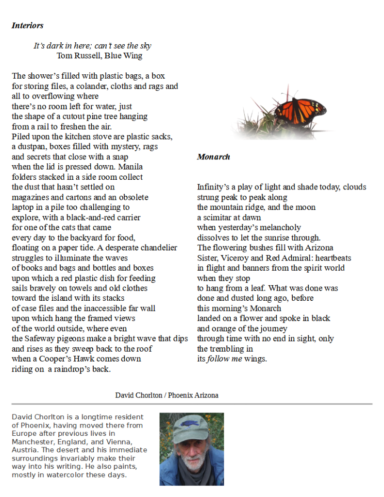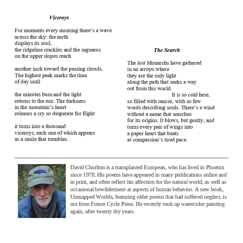 Available from the author, $20.00 includes postage and packaging. Checks to David Chorlton. Send address to DavidChorlton@centurylink.net
