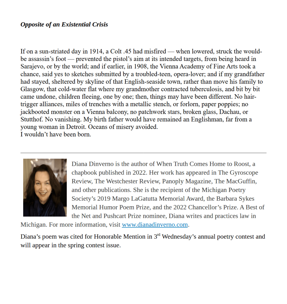 Diana Dinverno is the author of When Truth Comes Home to Roost (Celery City Chapbooks, 2022). Her work has appeared in The Gyroscope Review, The Westchester Review, Panoply Magazine, The MacGuffin, and other publications. A Best of the Net and Pushcart Prize nominee, Diana writes and practices law in Michigan. For more information, visit www.dianadinverno.com.